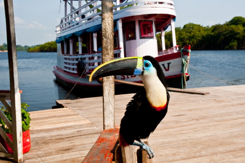 Tucano. O Amazonas é o maior estado do Brasil, com mais de 1,5 milhões de quilômetros quadrado.Grande parte do território é tomado pela Floresta Amazônica, preservada por diversas reservas ecológicas que ajudam a manter a sua enorme biodiversidade animal e vegetal. O tucano é uma ave típica da Amazônia, mas pode ser encontrado no Pantanal, no cerrado e até em países como o México. Exótica, a ave de bico enorme, se alimenta basicamente de frutas e pequenos insetos; gosta de se reproduzir em buracos nos topos das arvores, tomar bastante sol e é muito sensível ao frio. Amazonas (AM). Foto: David Rego Jr. *** Local Caption *** * Prazo indeterminado