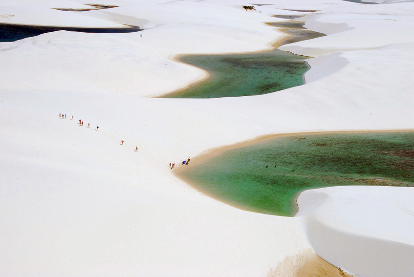 Raro e incomparável fenômeno da natureza, os Lençóis Maranhenses se estendem por 70 km ao longo da orla oceânica e avançam 50 km pelo continente, em direção ao interior, formando um grande areal, repleto de uma infinidade de poços, lagos e lagoas, de água doce e cristalina, cujos tons variam do azul ao verde. Lençóis Maranhenses (MA). Foto: MaurÃcio Moreira
