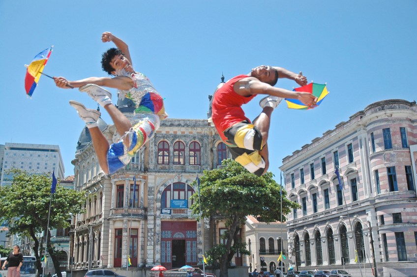 Dançarinos de frevo. O Frevo é um ritmo pernambucano derivado da marcha, do maxixe e da capoeira. Surgido no Recife no final do Século XIX, o frevo se caracteriza pelo ritmo extremamente acelerado. Muito executado durante o carnaval, eram comuns conflitos entre blocos de frevos, em que capoeiristas saíam à frente dos seus blocos para intimidar blocos rivais e proteger seu estandarte. Da junção da capoeira com o ritmo do frevo nasceu o passo, a dança do frevo. Recife (PE). Foto: Secretaria de Turismo do Recife